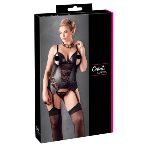 Szaténos anyagból készült harisnyatartós felső, virágos csipke berakásokkal, hátul rugalmas, áttetsző anyagból. Nyitott mellrésszel, hozzáillő tangával. A váll- és harisnyatartó pántok állíthatóak.