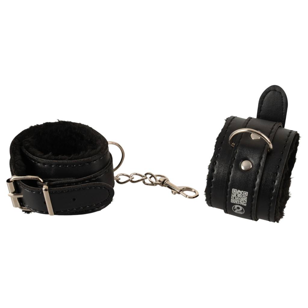 1 × pár puha bilincs – műbőr külső, puha párnázással, csattal állítható méret, fém elemekkel.